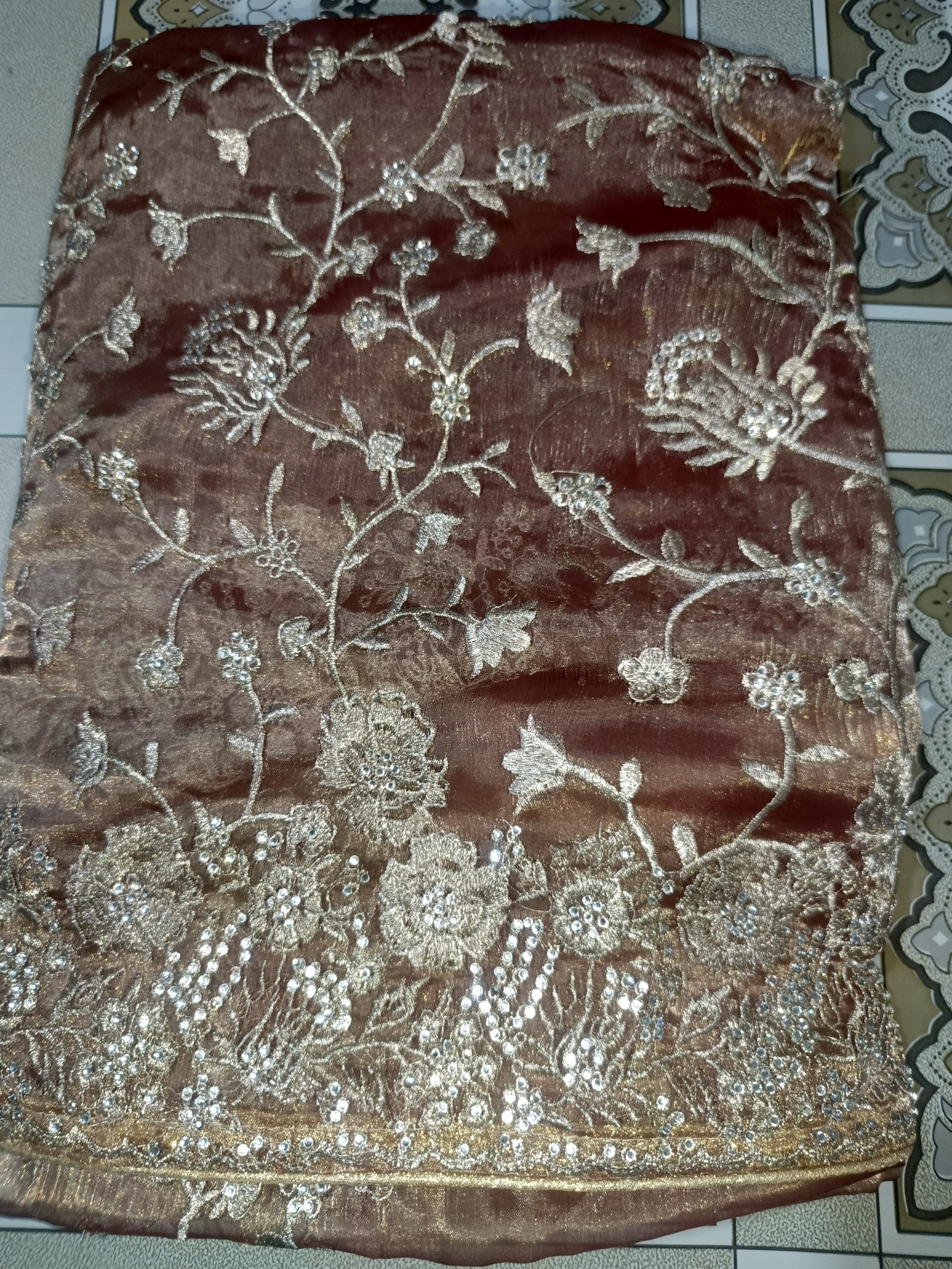 শাড়ির জমিন জুড়ে নিখুঁত এমব্রয়ডারির কারুকাজ আর প্রিমিয়াম স্টোনের ঝিলিক…